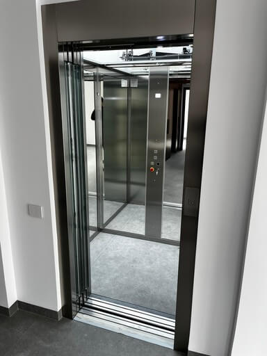 Puertas de cristal total (full glass) abiertas mostrando la cabina