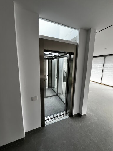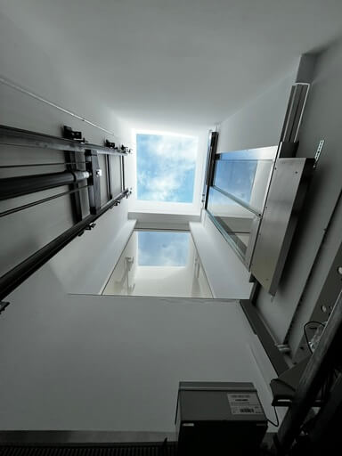 Además, a petición del cliente, hemos fabricado un techo de cabina en cristal, lo que permite disfrutar de la luz natural procedente del tragaluz superior del hueco del ascensor. El resultado es un espacio elegante, diáfano y con una experiencia de viaje única.