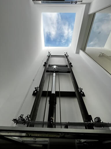 Detalle del elevador panorámico con estructura de acero y guías hidráulicas