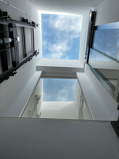 Vista del hueco del elevador con techo de cristal y entrada de luz natural